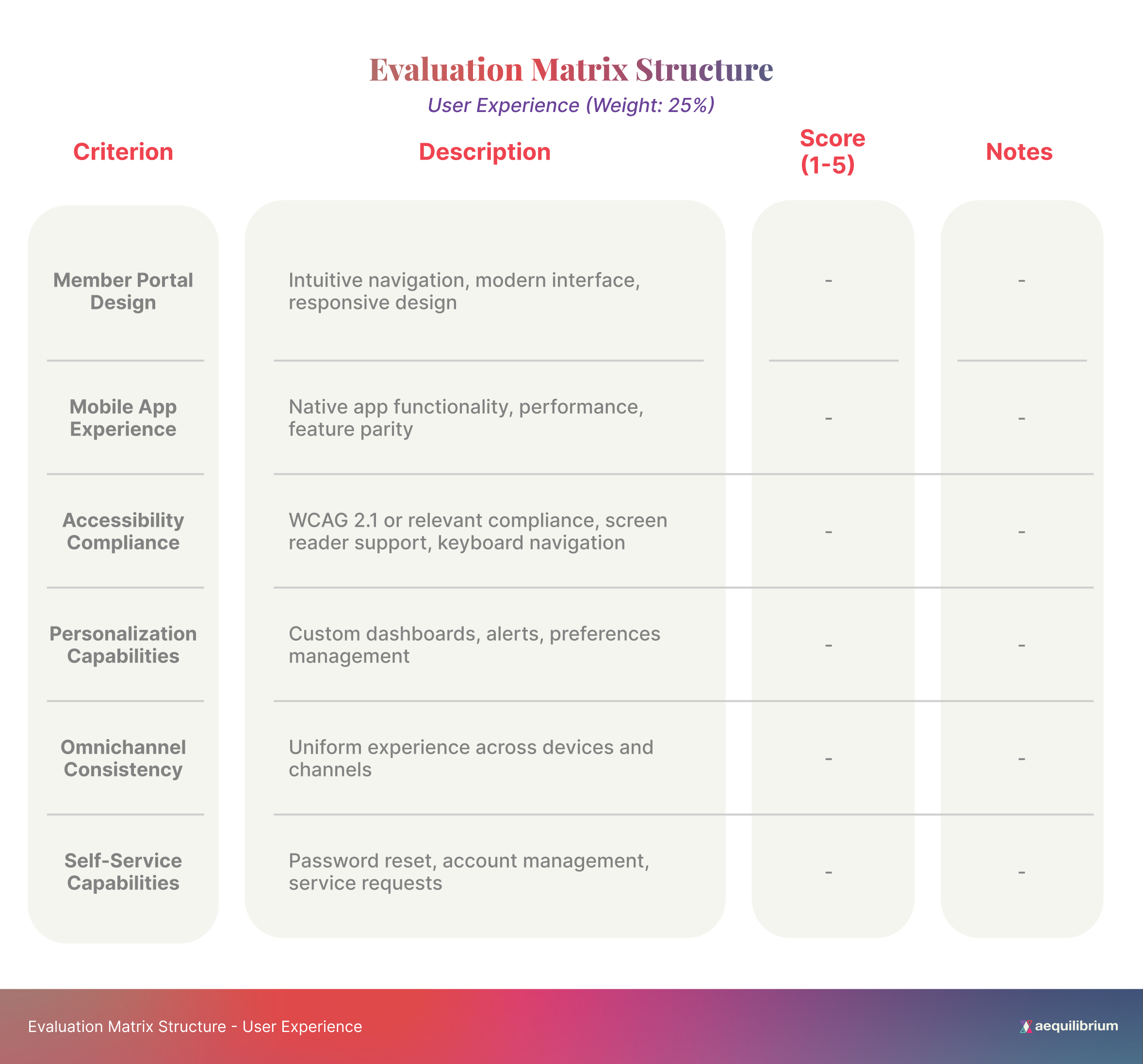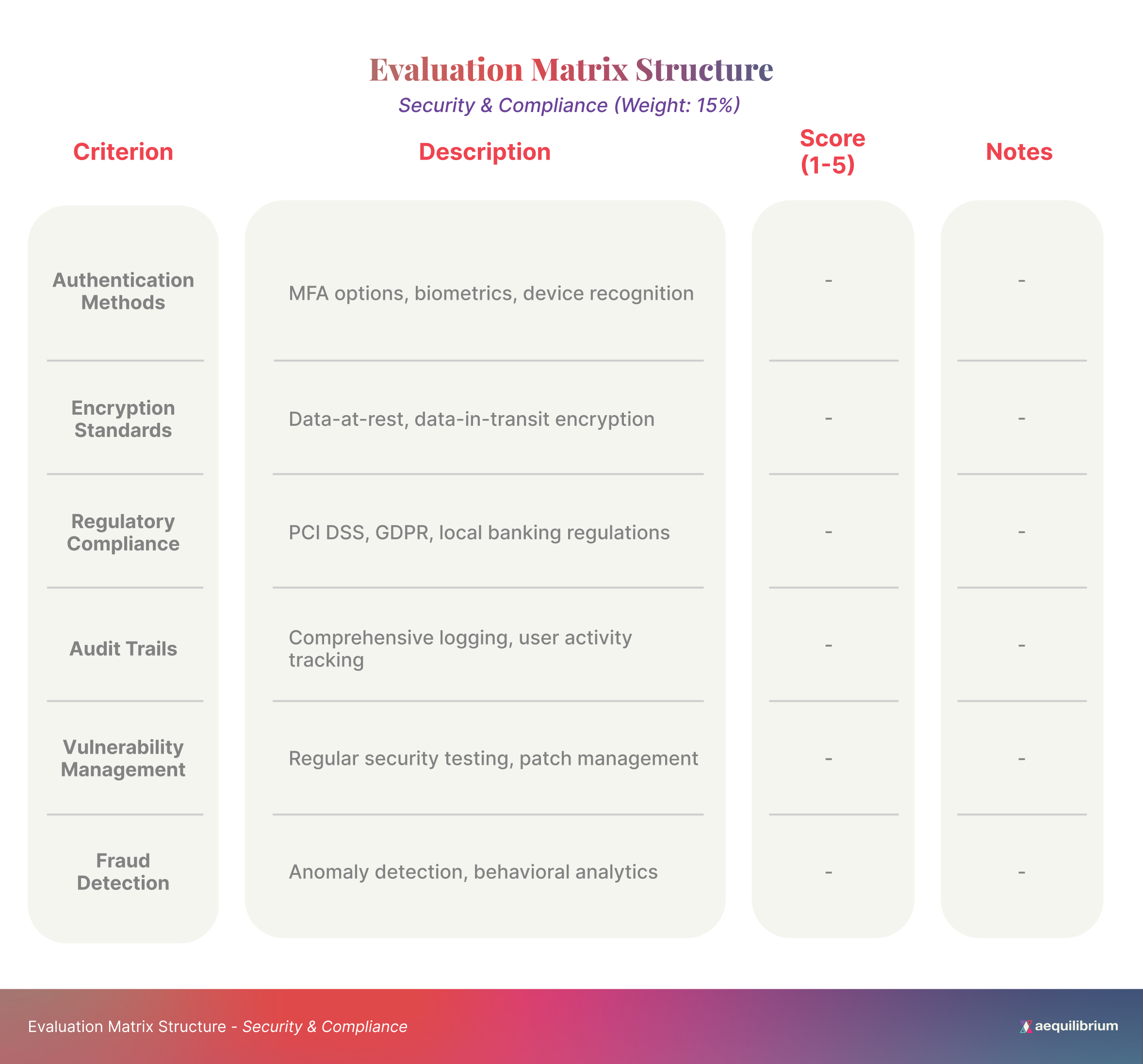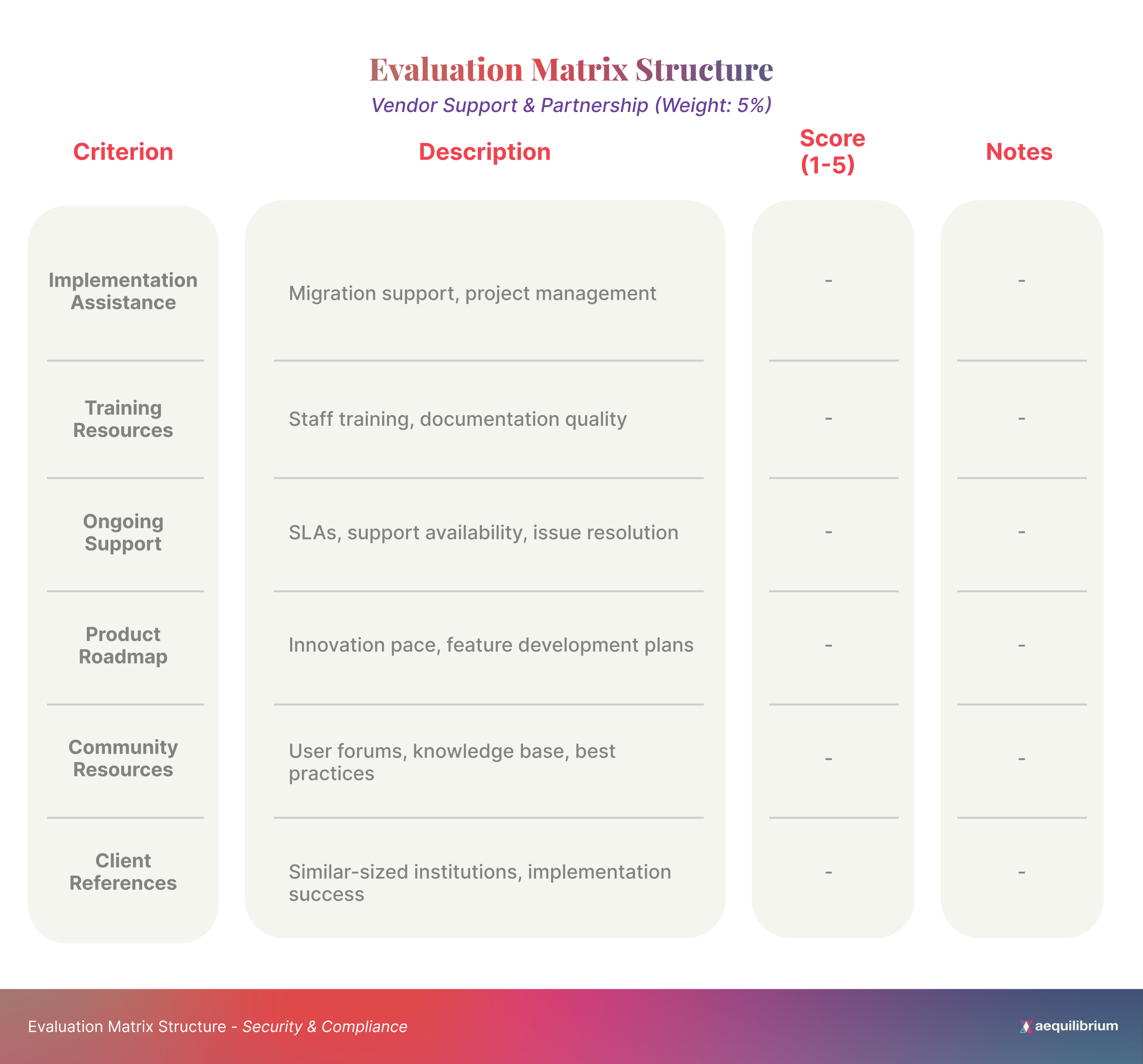 Scoring Methodology – Establish a consistent rating system (e.g., a 1-5 scale) for each criterion, with clear definitions of what constitutes each score level.