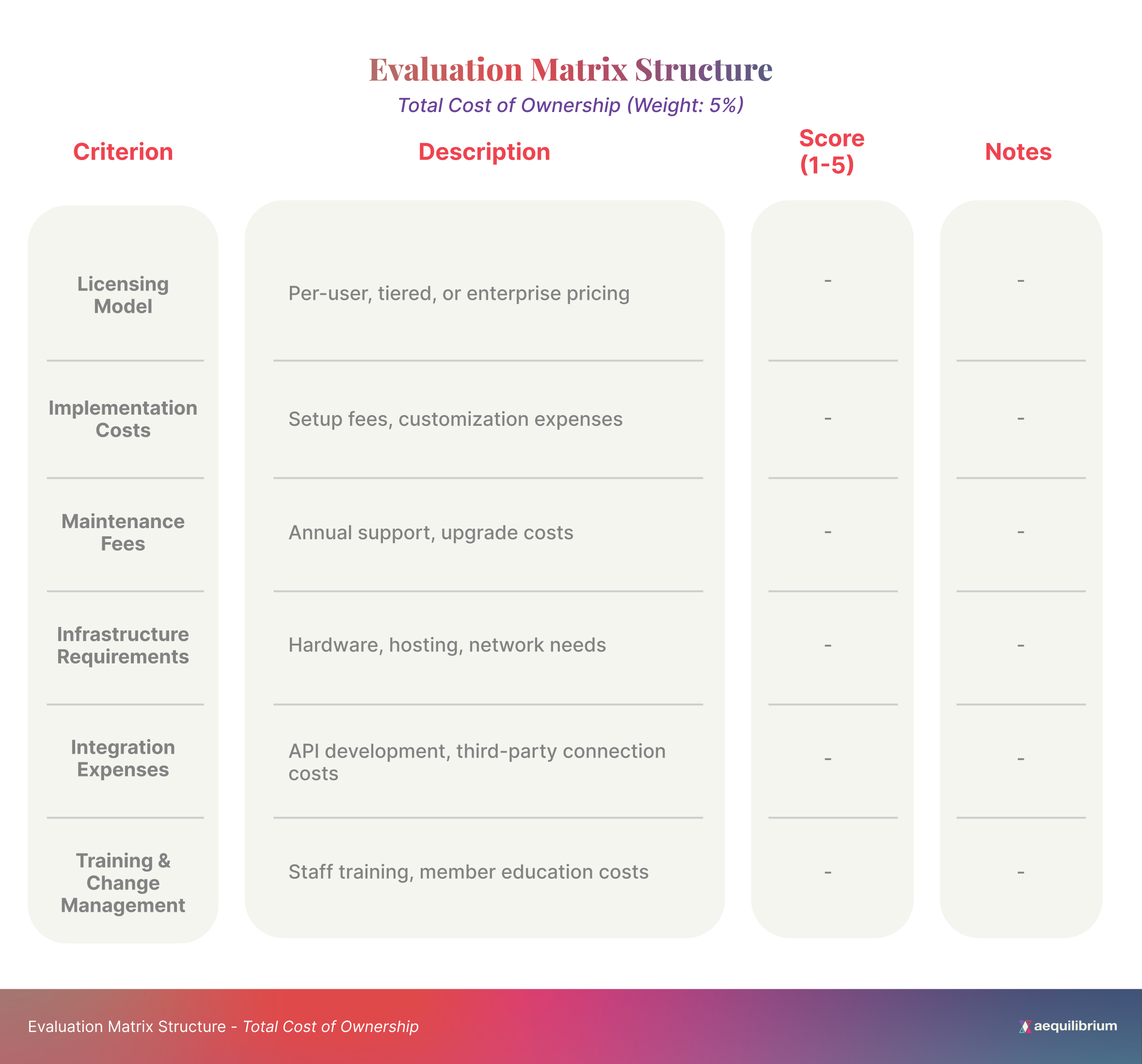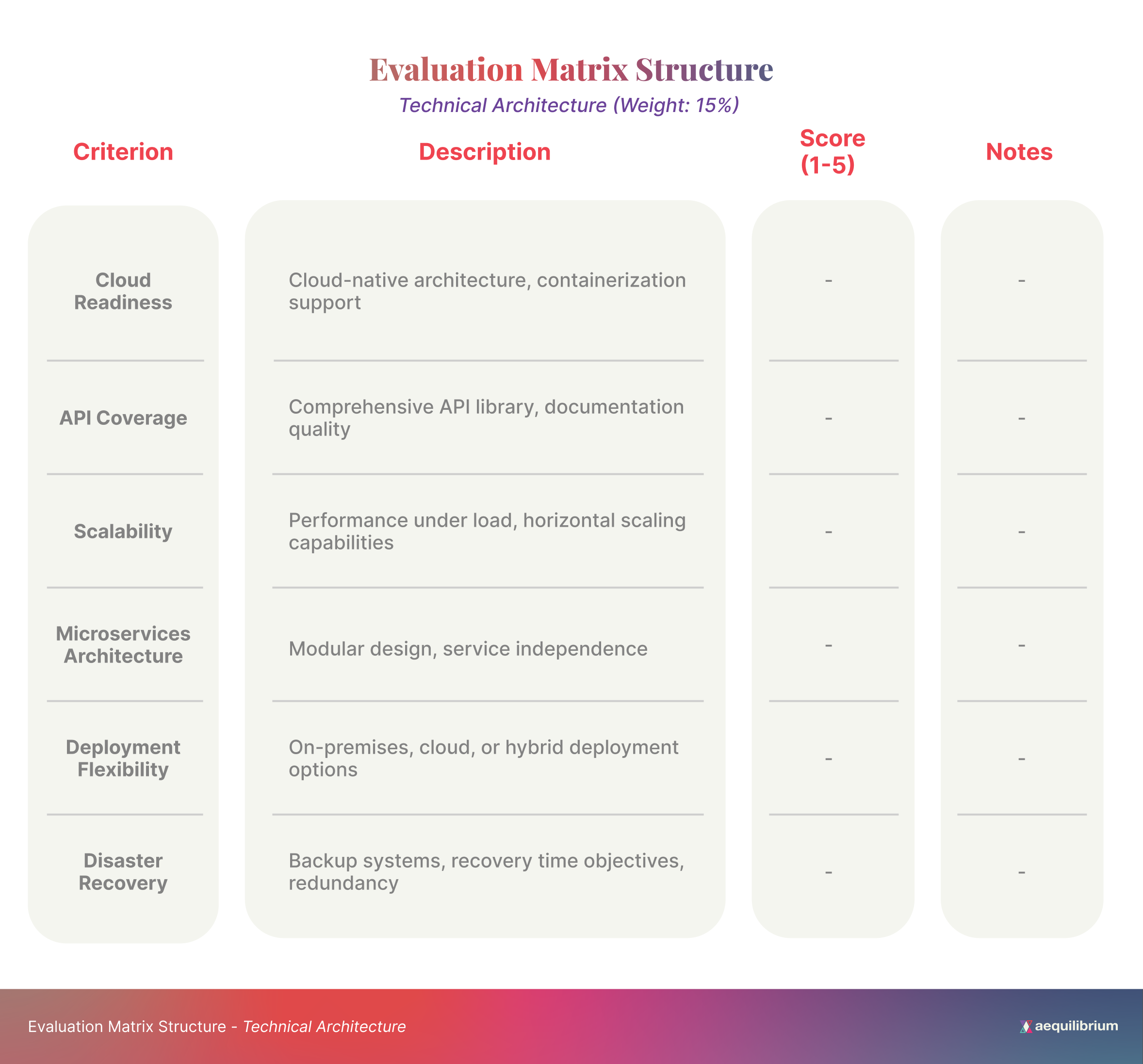 - Create a structured evaluation matrix with weighted categories
