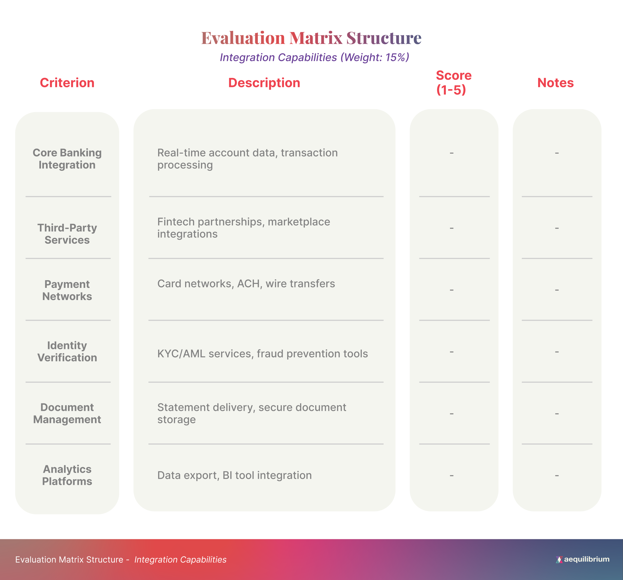 The matrix should be customized to reflect your credit union’s specific priorities and requirements. Consider adjusting the category weights or adding additional criteria that align with your strategic objectives and member needs.